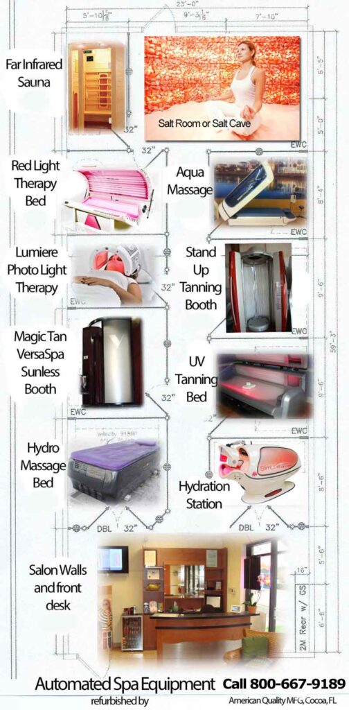 Found here are used tanning beds for sale with a warranty and free delivery anywhere in the USA!  Also found below is our “automated spa in a box” turnkey solution we offer to customers who have an empty space which measures about 20 feet wide and at least 60 feet deep.  If you have not heard, we now recommend all tanning salon owners and new prospective owners to consider the “automated spa or wellness center” business model.